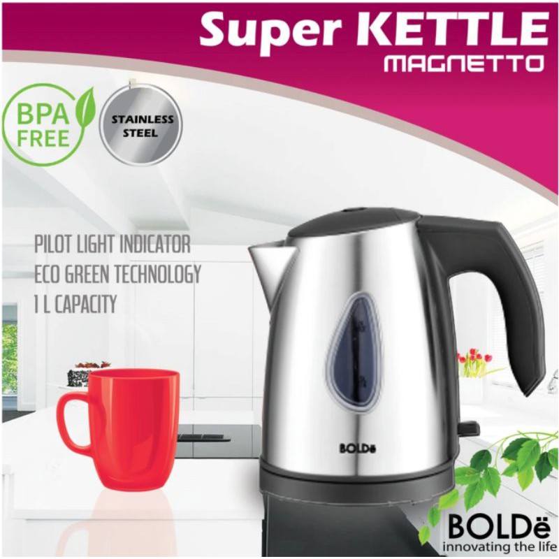 BOLDe Magnetto Super Kettle / Pemanas AirSeri terbaru dari BOLDe Super Kettle!Mempersembahkan BOLDe Super Kettle Magnetto, produk alat pemanas air instan yang terbuat dari material stainless steel. Diproduksi dengan teknologi Jerman Eco Green, memastikan molekul bakteri akan mati pada saat air mencapai titik didih, sehingga keamanan air yang anda konsumsi terjamin. BOLDe Super Kettle Magnetto merupakan produk dengan kualitas terbaik yang dapat memanaskan air dalam waktu kurang dari 6 menit.Keunggulan- Pilot Light Indicator, memberi tanda ketika air telah mendidih dengan indikator lampu- Stainless Steel, membuat air cepat mendidih hanya dalam waktu kurang dari 6 menit.- Steam Induction Switch, merupakan teknologi pemanas ganda sehingga membuat air cepat mendidih.- Automatic Power Off, dilengkapi dengan power off otomatis sehingga akan tombol power akan mati sendiri saat air sudah mendidih.- High Temperatur Protection, perlindungan untuk temperatur yang terlalu panas.- BPA Free, material ketel terbebas dari bahan kimia berbahaya.Spesifikasi Produk :Power : 1100 – 1300 WVoltage : 220 -240 VCapacity : 0,9 – 1 LGaransi : 1 Tahun#bolde #kettle #pemanasair #superkettle #magnetto #tekoair #tekope